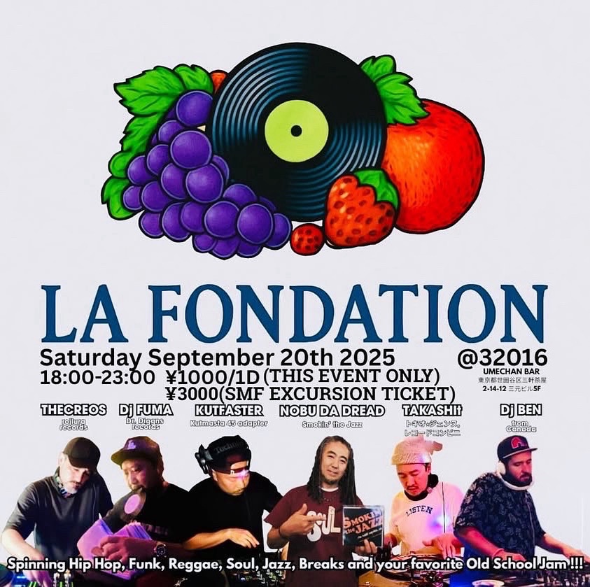 LA FONDATION Crew is pulling out all the stops for our 57th edition bash! Join us on September 20th from 6:00 PM to 11:00 PM in Sangenjaya for an electrifying night of vinyl magic! 🎶 🔥 Are you ready to party like never before? DJs: DJ FUMA (Dr. Diggns Records) THECREOS (Rojiura Records) KUTFASTER (Kutmasta 45 Adapters, FoundationRadio.ca) NOBU DA DREAD (Smokin' the Jazz) TAKASHiT (トキオ*ジェンヌ, たまり場) DJ BEN (from Canada, たまり場) Get ready to be transported through time as our DJs take you on a journey through the best of Hip Hop, Funk, Reggae, Soul, Jazz, Breaks, and your favorite Old School Jams! Let's celebrate a legendary nights of music, dance, and unforgettable memories! Sip and Savor: Indulge in an exclusive selection of rare craft beverages, including Nihonshu (Japanese sake), Shochu, Umeshu, and Liqueurs that will tantalize your taste buds! 🍶 Spread the word, gather your squad, and let's ignite the dance floor in a blaze of celebration! Don't miss out on this funky event! 💥 🎟️ Entry: ¥1000/1D 📍 Venue: @32016 (Umechan bar) 🏢 Address: 2-14-12 Sangenjaya, Setagaya-ku, Tokyo Soundcloud: https://soundcloud.com/kutfaster/kut-vinyl https://soundcloud.com/thecreos/revenge-of-the-beat-box https://soundcloud.com/kutfaster/smokin-the-jazz-45s Youtube: https://www.youtube.com/watch?v=wTFt69aTs4k&t=12s https://www.youtube.com/watch?v=l4emPxGzx8s https://www.youtube.com/watch?v=MqubKED-TnI&t=203s https://www.youtube.com/watch?v=Y0b8dItVBvs https://www.youtube.com/watch?v=WaEa_C1DxA4 #HipHopVinyl #VinylGroove #VinylCulture #HipHopParty #HipHopBeats #OldSchoolJams #VinylDJ #VinylRecords #VinylRevival #HipHopNight #VinylLove #Sangenjaya #TokyoNightlife #DJFUMA #THECREOS #KUTFASTER #NOBUDADREAD #DJBEN #TAKASHiT #ClubEvent #TokyoEvents #HIPHOP See less